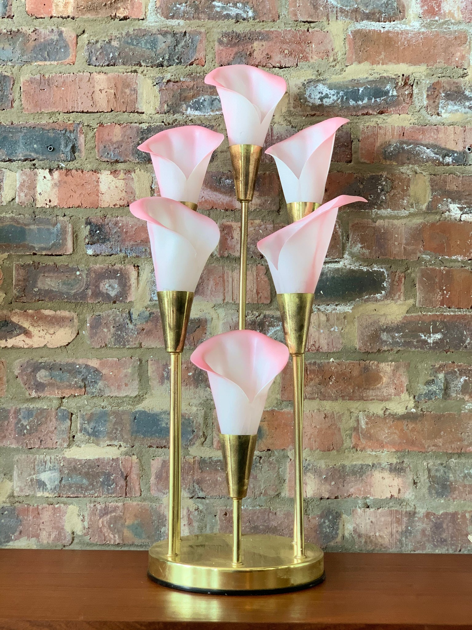 A striking Hollywood Regency–style novelty lamp, designed with three arum-lily–inspired shades crafted from moulded plastic.